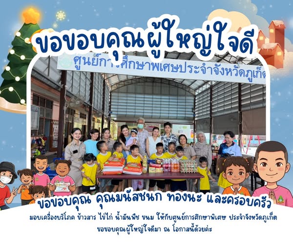 ในวันจันทร์ที่ 22 ธันวาคม พ.ศ. 2568 ขอขอบคุณ คุณมนัสชนก ทองนะ และครอบครัว มอบเครื่องบริโภค ข้าวสาร ไข่ไก่ น้ำมันพืช ขนม ให้กับศูนย์การศึกษาพิเศษ ประจำจังหวัดภูเก็ต ขอขอบคุณผู้ใหญ่ใจดีมา ณ โอกาสนี้ด้วยค่ะ