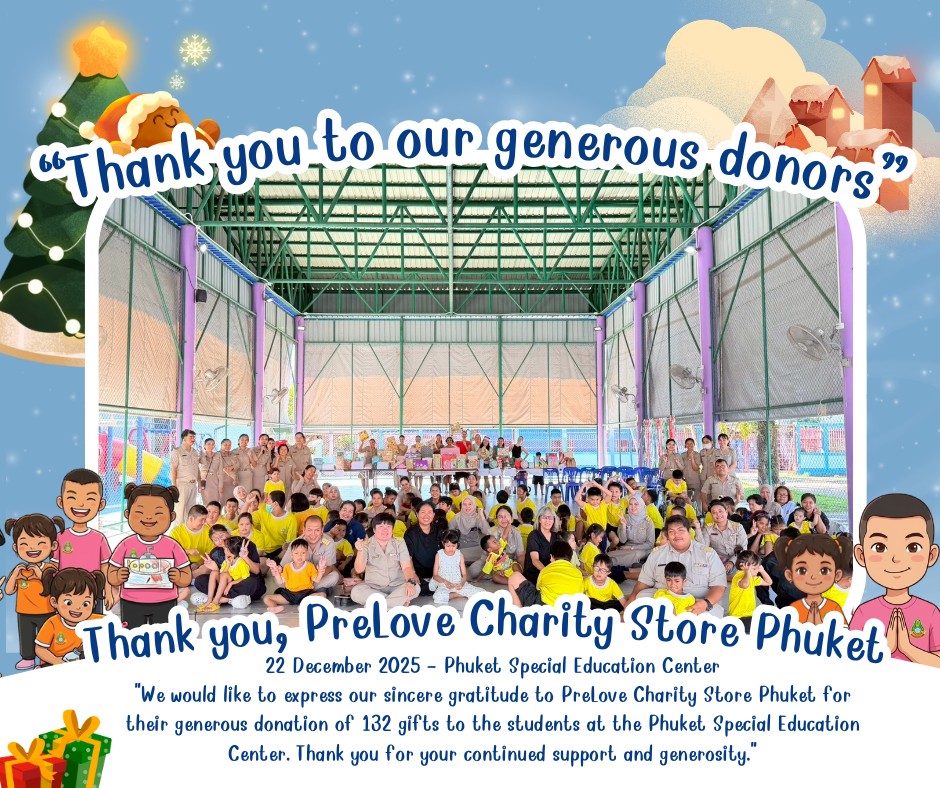 22 December 2025 – Phuket Special Education Center “We would like to express our sincere gratitude to PreLove Charity Store Phuket for their generous donation of 132 gifts to the students at the Phuket Special Education Center. Thank you for your continued support and generosity.”